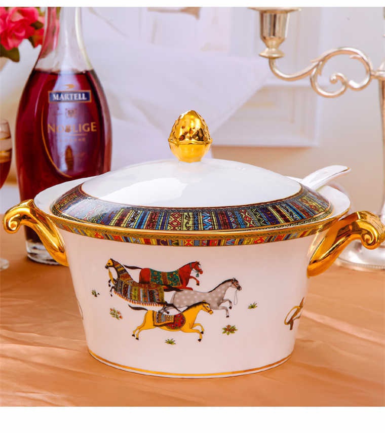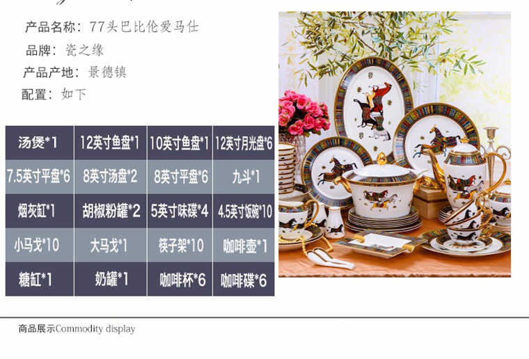 77頭巴比倫愛馬仕,一個(gè)湯煲,一個(gè)12寸魚盤,一個(gè)10寸魚盤,六個(gè)12寸月光盤,六個(gè)7.5寸平盤,兩個(gè)8寸湯盤,六個(gè)8寸平盤,一個(gè)九斗,一個(gè)煙灰缸,兩個(gè)胡椒粉罐,四個(gè)5寸味碟,十個(gè)4.5寸飯碗,十個(gè)小馬戈,一個(gè)大馬戈,十個(gè)筷子架,一個(gè)咖啡壺,一個(gè)糖缸,一個(gè)奶罐,六個(gè)咖啡杯,六個(gè)咖啡碟。