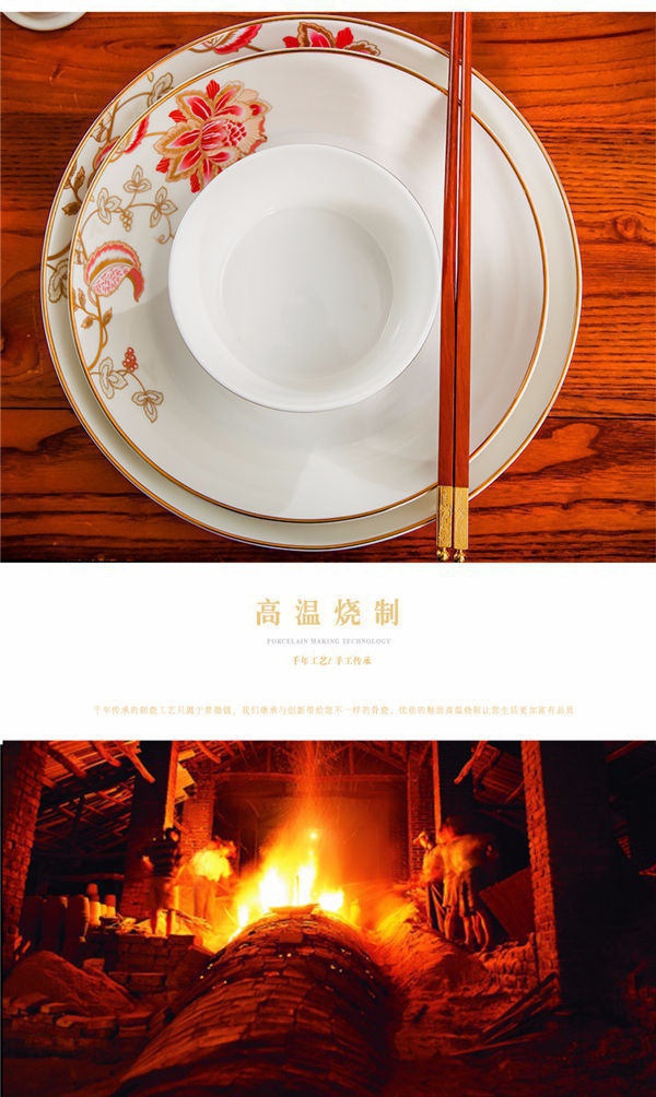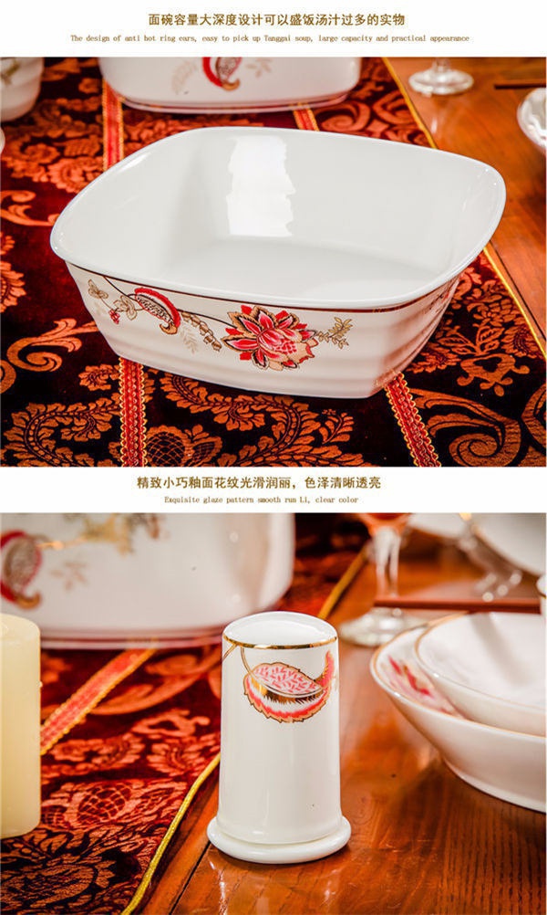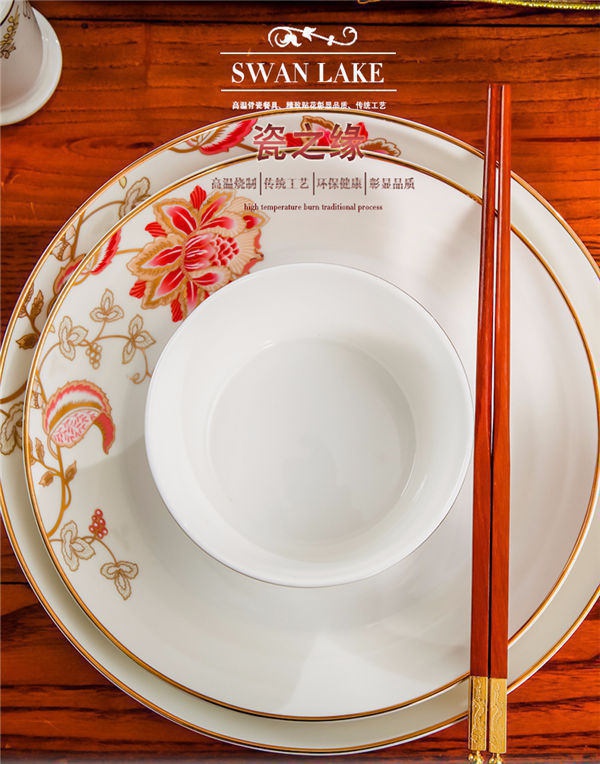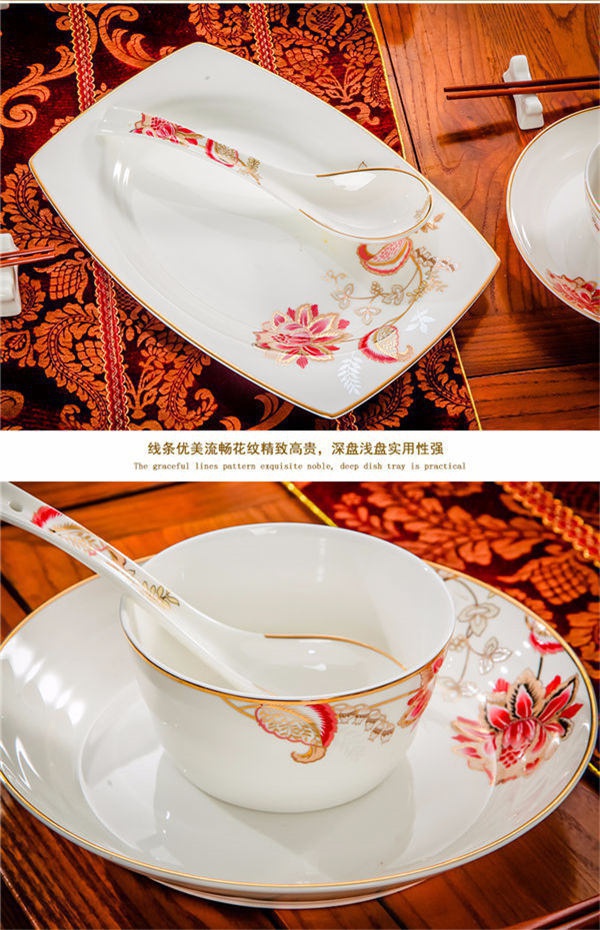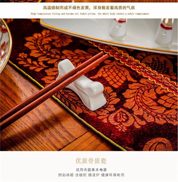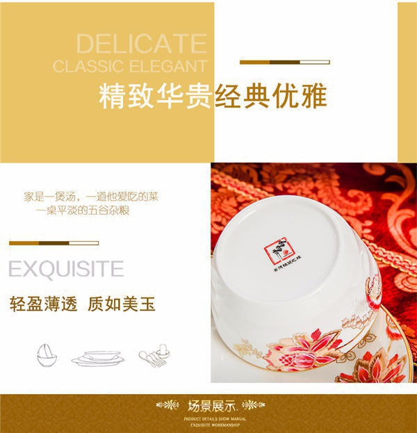 65頭醉花吟,一個湯煲,一個魚盤,一個大飯勺,一個大湯碗,一個牙簽筒,六個面碗,四個三寸碟,十個盤子,十個4.5寸飯碗,十個五寸骨碟,十個調(diào)羹,十個筷子架。