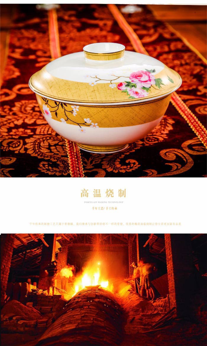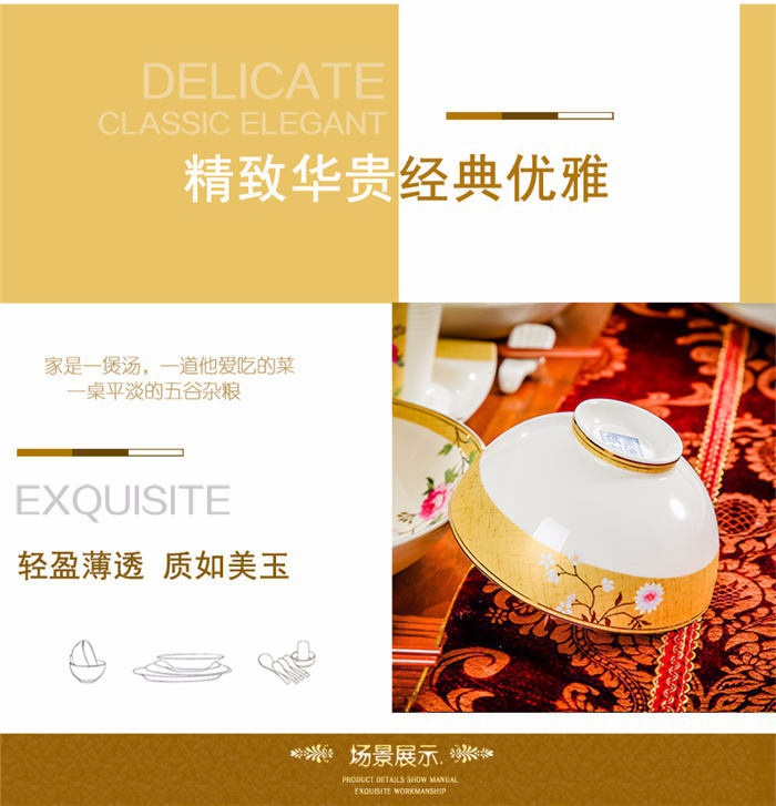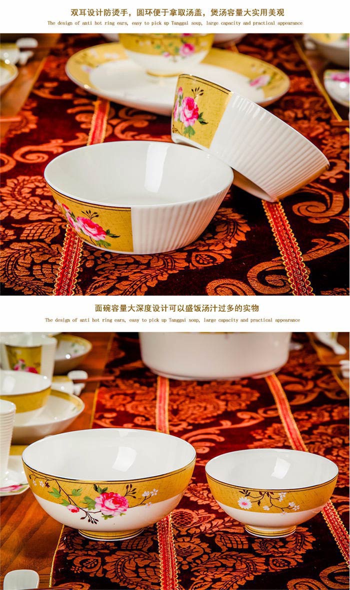 72頭花木蘭餐具,餐具60頭 ,一個湯煲,一個魚盤,一個十寸圓盤,一個牙簽筒,一個花籃,一個大飯勺,兩個調(diào)料壺,兩個蓋碗,四個碗,十個4.5寸飯碗,十個4寸湯碗,十個8寸盤,十個調(diào)羹,十個筷子架,