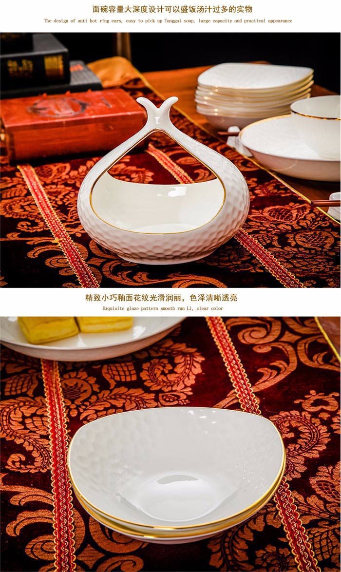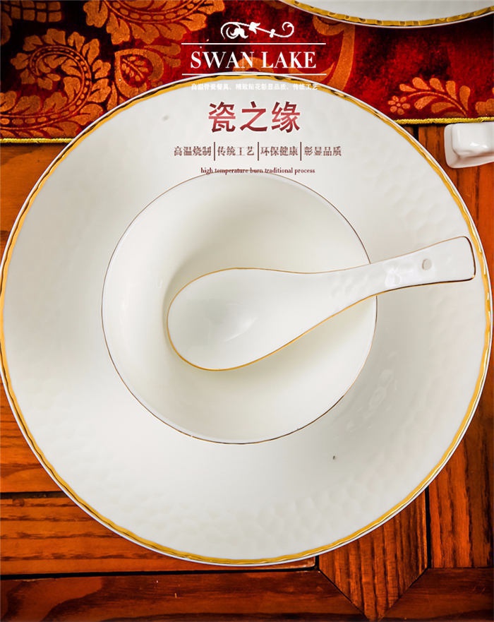 60頭水立方,一個(gè)湯煲,一個(gè)魚盤,一個(gè)十寸圓盤,一個(gè)飯勺,一個(gè)花籃,一個(gè)牙簽筒,四個(gè)面碗,十個(gè)4.5寸飯碗,十個(gè)三角骨碟,十個(gè)八寸盤,十個(gè)調(diào)羹,十個(gè)筷子架。