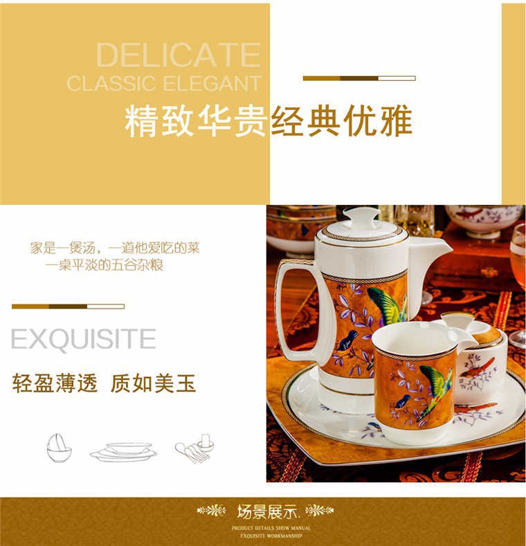 78頭愛丁堡餐具,一個湯煲,一個魚盤,一個十寸盤,一個飯勺,一個花籃,兩個醋料壺,一個牙簽筒,雙層果盤一個,十個4.5寸的碗,十個調(diào)羹,十個筷子架,六個8寸盤,兩個9寸盤,六個面碗,四個碗蓋,一打筷子,另外咖啡具有六個杯子,六個碟子,一個壺,一個糖缸,一個奶罐。